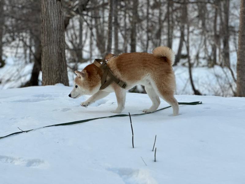 主人は雪の上に足を下ろしていますが、